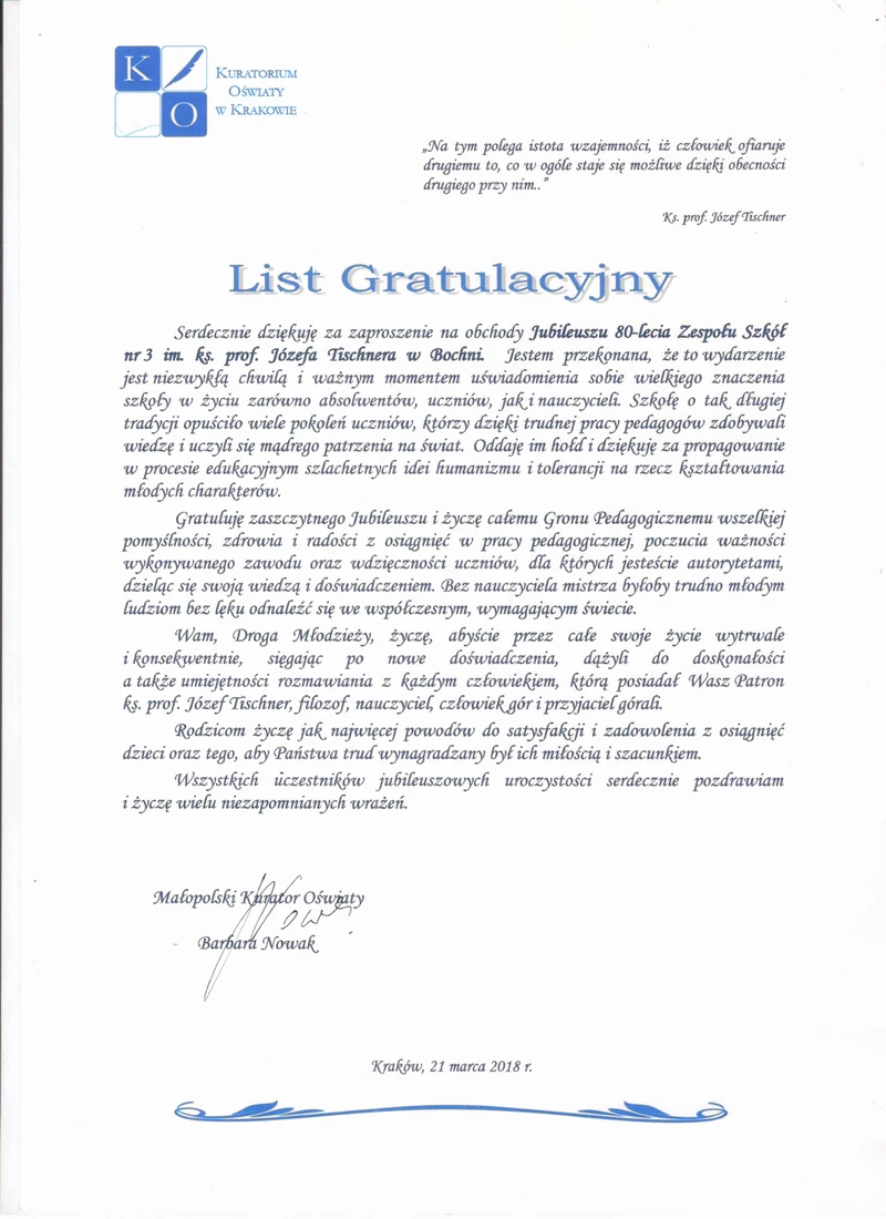List Gratulacyjny Małopolskiego Kuratora Oświaty Pani Barbary Nowak.
