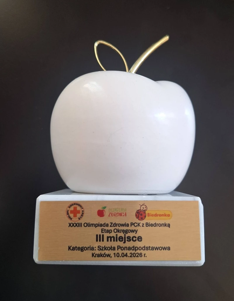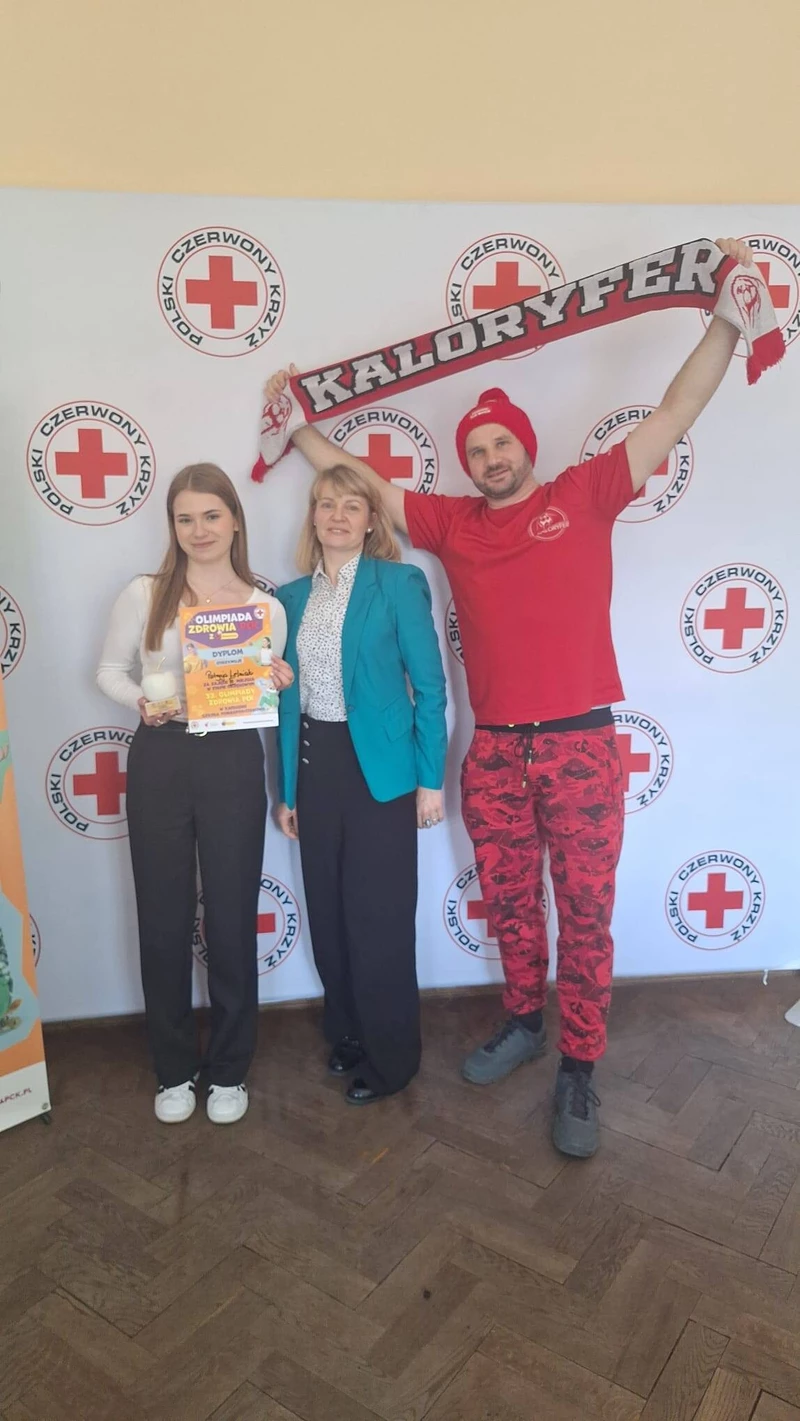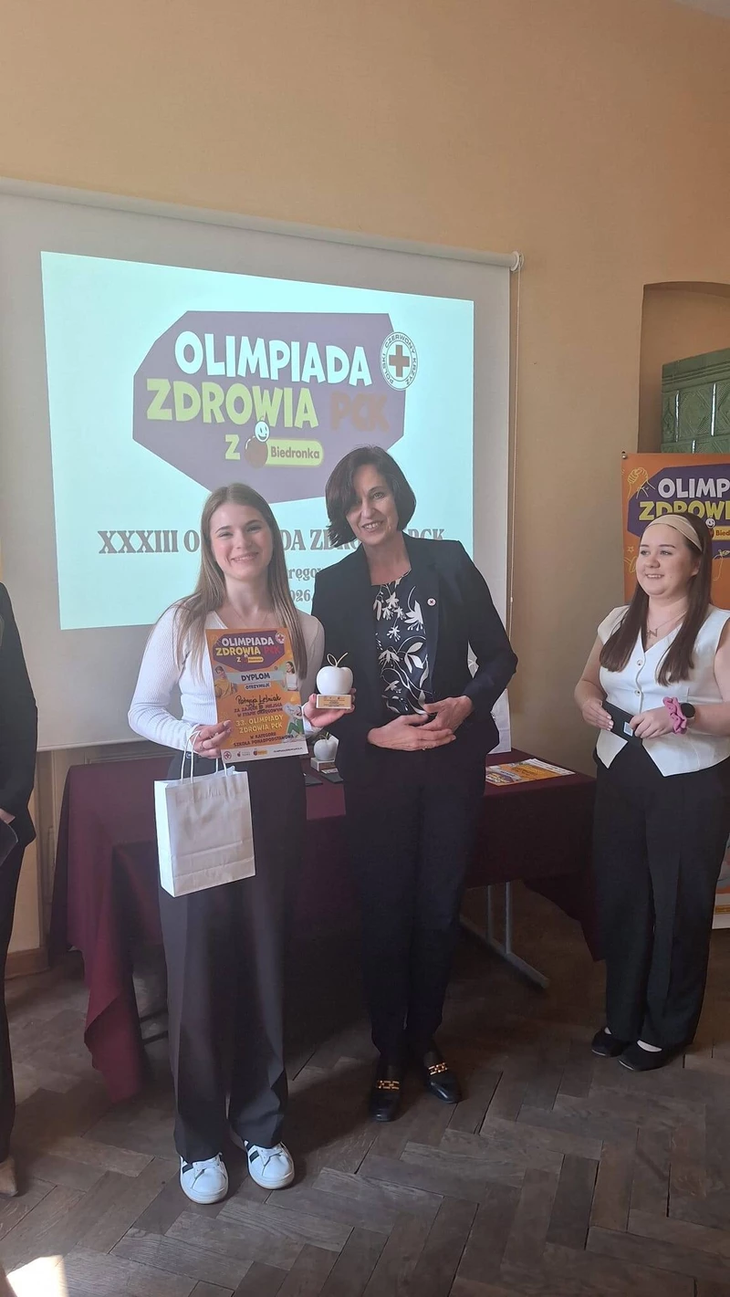 Patrycja Leśniak z klasy 4 Tb zdobyła III miejsce w okręgowym etapie Olimpiady Polskiego Czerwonego Krzyża z Biedronką. To wyjątkowe osiągnięcie jest dowodem jej szerokiej wiedzy, zaangażowania oraz wrażliwości na potrzeby drugiego człowieka.