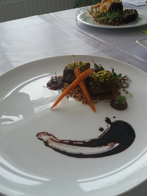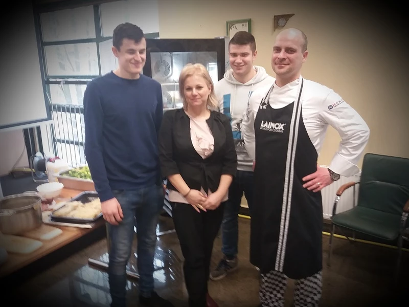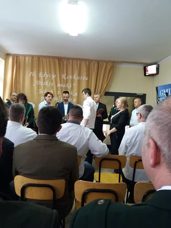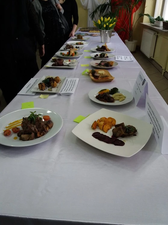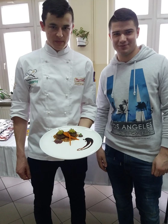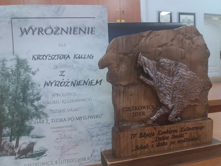 Dziczyzna to tzw. „trudny surowiec”, a jednak już po czwarty do rywalizacji w konkursie „Dzikie smaki” w Zespole Szkół Ogólnokształcących i Zawodowych w Ciężkowicach stanęli uczniowie szkół gastronomicznych z południa Polski, od Krościenka nad Dunajcem przez Tarnów po Bochnię. Jego tegoroczna edycja, została zatytułowana „Schab z dzika po myśliwsku”, stąd organizatorów wsparł również Tarnowski Związek Łowiecki. Konkurs „Dzikie Smaki” ma w swoim założeniu przybliżyć przyszłym szefom kuchni temat dziczyzny, mało znanej szerokiemu społeczeństwu. Ma nawiązywać do tradycji staropolskiej kuchni, gdzie kiedyś dary pól i lasów były ważnym składnikiem menu. Ma także propagować zdrową żywność, a dzik z pewnością do takiej należy. Naszą szkołę reprezentowała uczeń z klasy 4 Technikum Żywienia i Usług Gastronomicznych – Krzysztof Kulig pod opieką pani Anety Wojcieszek i to właśnie jemu przyznano szczególne wyróżnienie. Krzysztof podał: Schab z dzika sous-vide w panierce pistacjowej na porowym sianie z musem cebulowy i preparowaną kaszą gryczaną. Jury doceniło technikę i stopień trudności wykonanej potrawy, porządek i czystość na stanowisku, wyrafinowany smak, dobór składników i sposób podania. Sukces Krzysztofa wiązał się nie tylko z dyplomem i satysfakcją ale również z cennymi nagrodami gastronomicznymi. Gratulujemy!