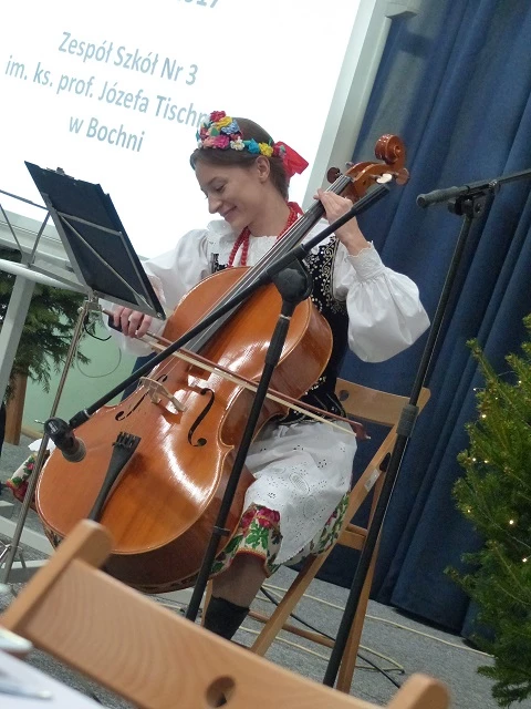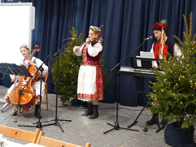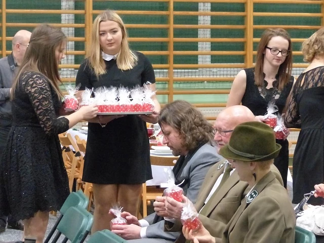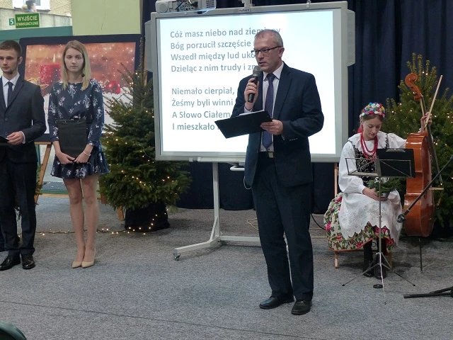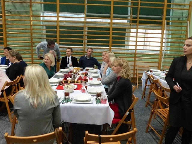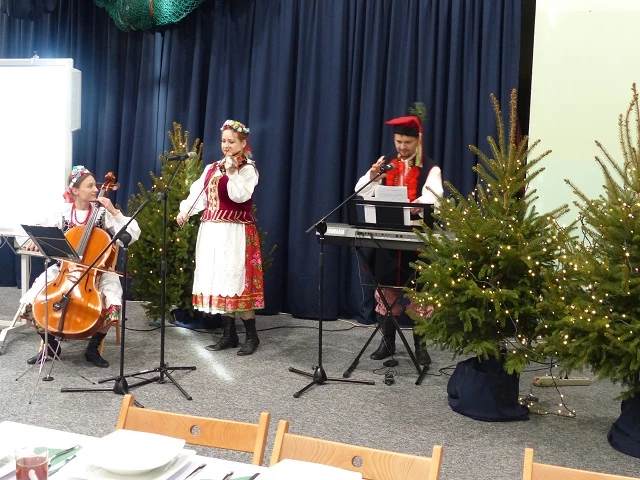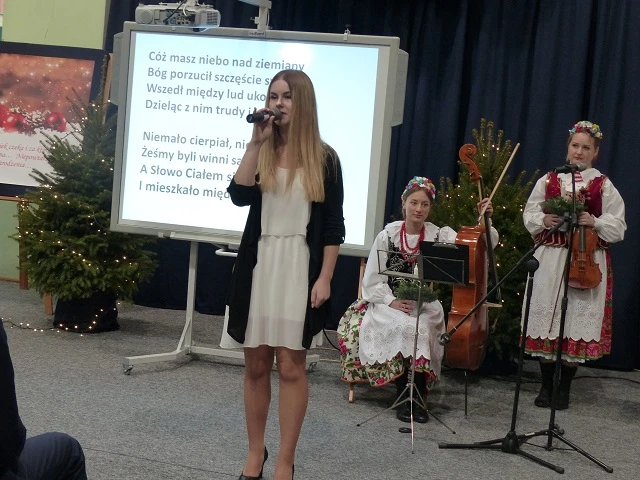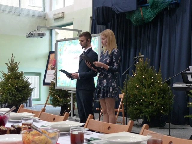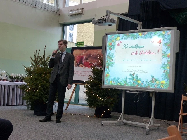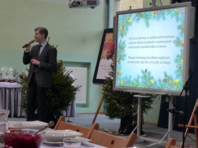 Prelegent bardzo przystępnie przekazał wiedzę naszym uczniom rozszerzając ich horyzonty z tematyki prozdrowotnej, która jest niezwykle pomocna w kształceniu przedmiotów gastronomicznych. W chwilę tego cudownego bożonarodzeniowego nastroju miłości i radości wprowadziło wspólne kolędowanie, a następnie radujący zmysły koncert kolęd i pastorałek wykonany przez grupę Consonare. W dalszej części programu młodzież miała możliwość przedstawić prezentację - "Tradycje wigilijne państw Unii Europejskiej" oraz zaprosić do wspólnie przygotowanej wieczerzy wigilijnej.